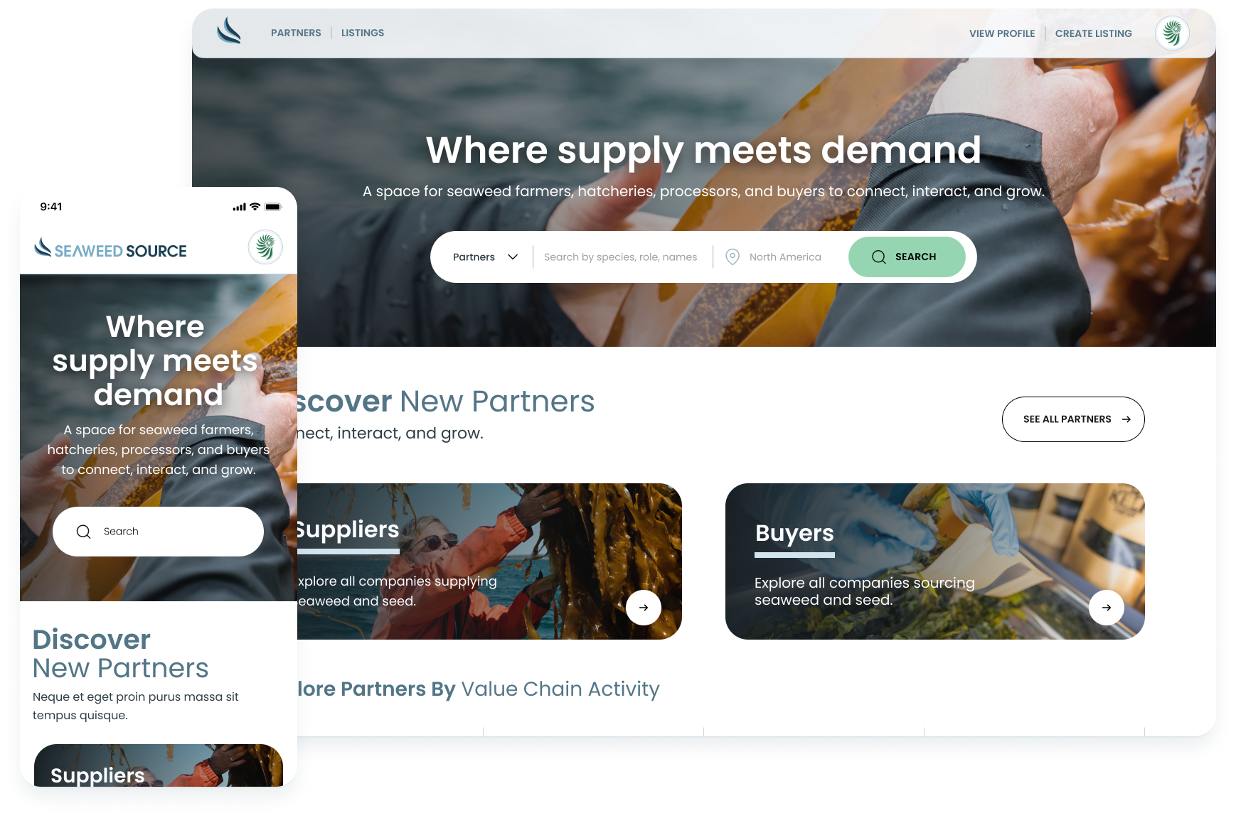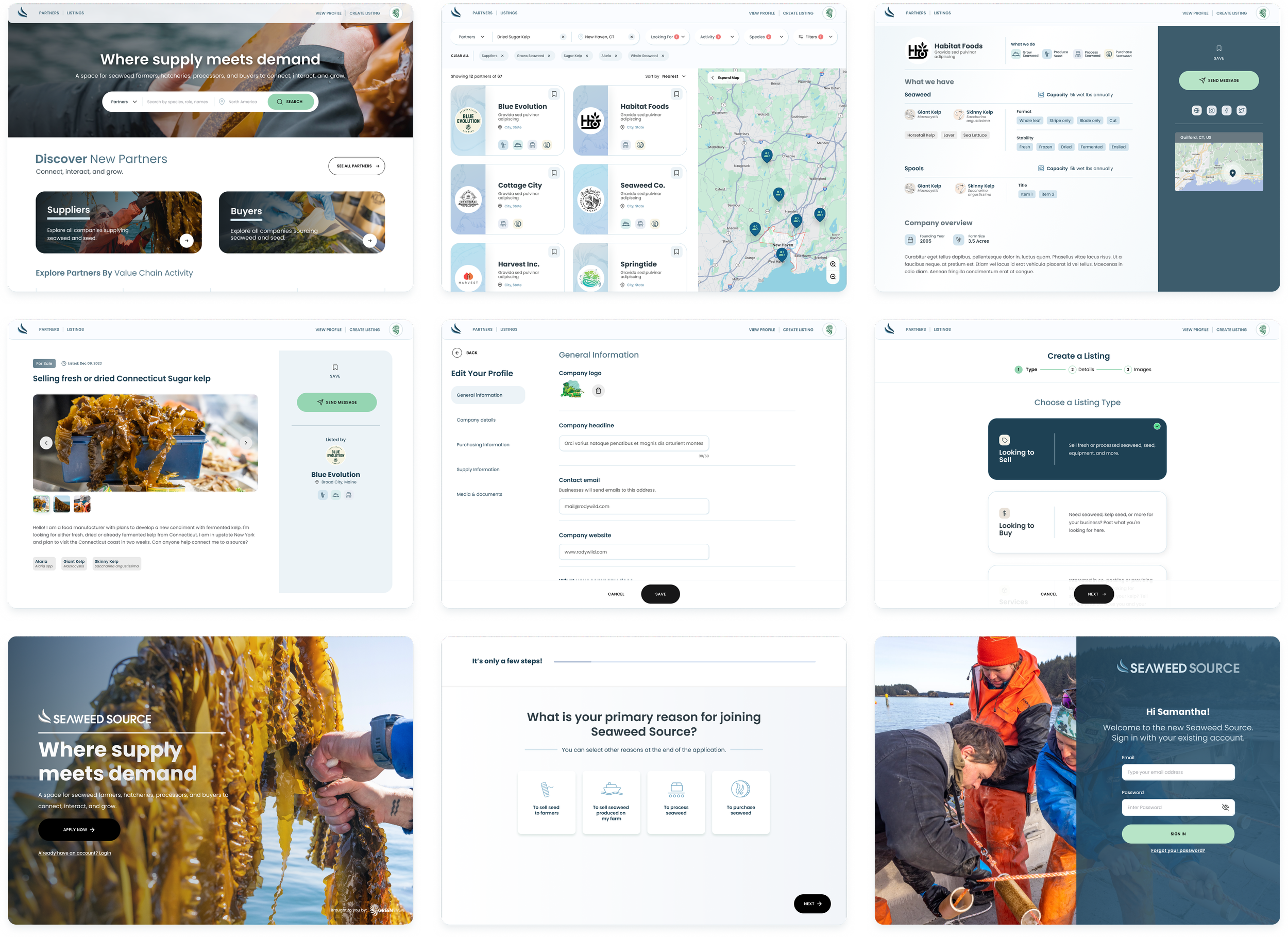 Seaweed Source is a B2B platform designed to connect seaweed farmers, processors, hatcheries, and buyers in one digital marketplace. Created to support small and medium-scale ocean farmers, the platform opens up new business opportunities and fosters industry growth. GreenWave approached my agency to design and launch this relationship-focused platform from the ground up.